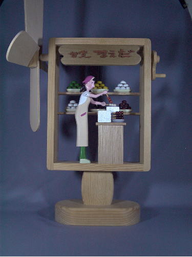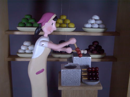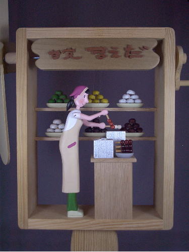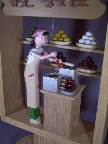 | お団子屋さんへの開店祝いです。 団子を持った両手が動くからくり人形です。 |