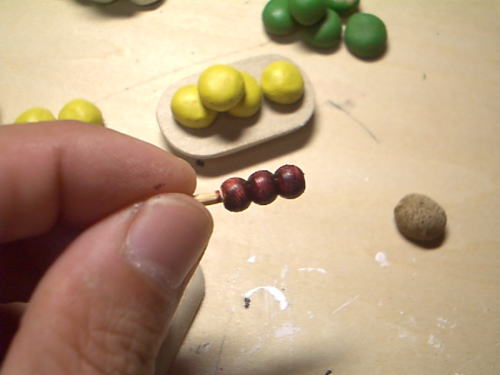 | 右手の団子はたれの中に、左手の団子は焼いています。 |