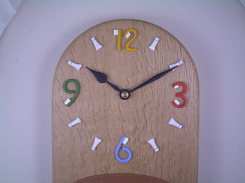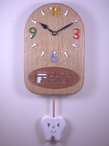 | 「ふじおか歯科医院」様への開院祝いの振り子時計です。 振り子はかわいい「歯」のかたちです。のんびり〜ゆらゆら〜とゆれます。 文字盤は「歯ブラシ」と「歯磨き粉」を使っています。 時計のムーブメントと針以外はすべて木製の振り子時計です。 歯科医院様への開院のお祝い、記念として大変好評の「開院祝いの時計」です。 |