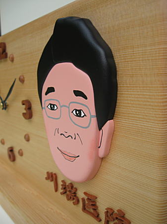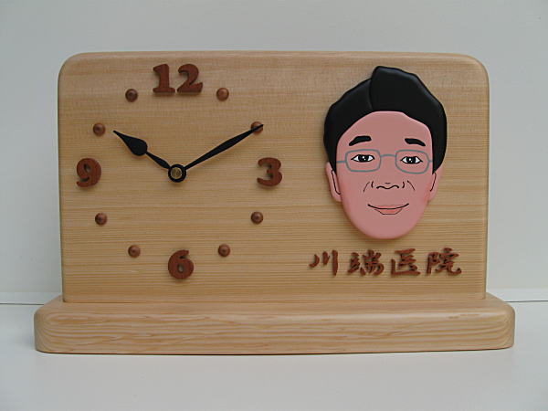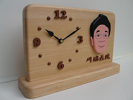 | 「川端医院」様への開院祝いです。 「先生の似顔絵」と「医院名」入りの置き時計です。 ご依頼主様より「先生のお顔」と「医院のロゴ」を頂き、それを基にお作りいたしました。 医院名は医院でお使いのものをそのまま利用しています。 時計のムーブメントと針以外はすべて木製の時計です。 |