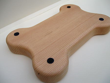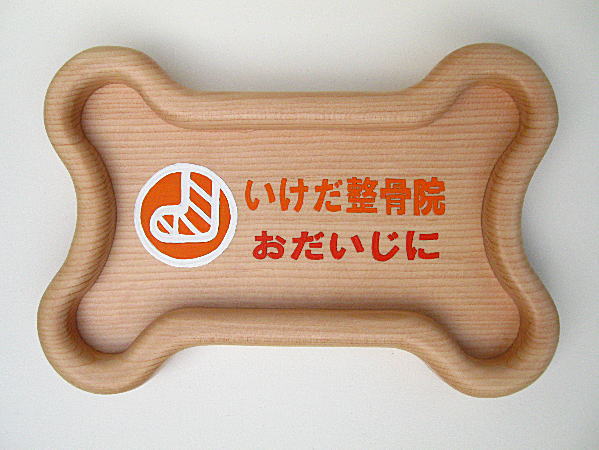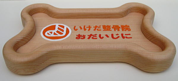 | お会計時に使用する木製の「マネートレー」です。 人気の「丸型マネートレー」を骨の形にアレンジしました。 パッと思いついたアイデアでしたが、完成品は非常に良いです。 ロゴマークは医院のロゴマークをそのまま利用しています。 |