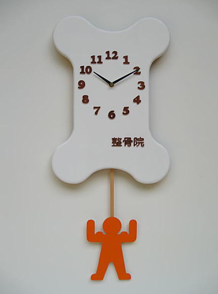 | 東京都の「整骨院」様への開院祝いの振り子時計です。 整骨院ということで「骨」を本体に使っています。 振り子はご依頼主様のアイデアで「マッチョ」なタイプにアレンジしました。 振り子のデザインは自由に変更できます。 医院のマークがある場合はそれを使うのも良いと思います。 |