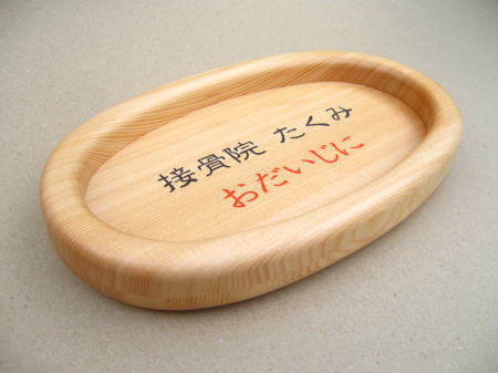 | お会計時に使用する木製の「マネートレー」です。 まんまるでかわいいタイプです。 この作品は医院様のロゴの字体をそのまま利用しています。 イラスト・コメントは自由に変更できます。 |