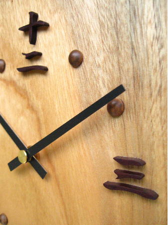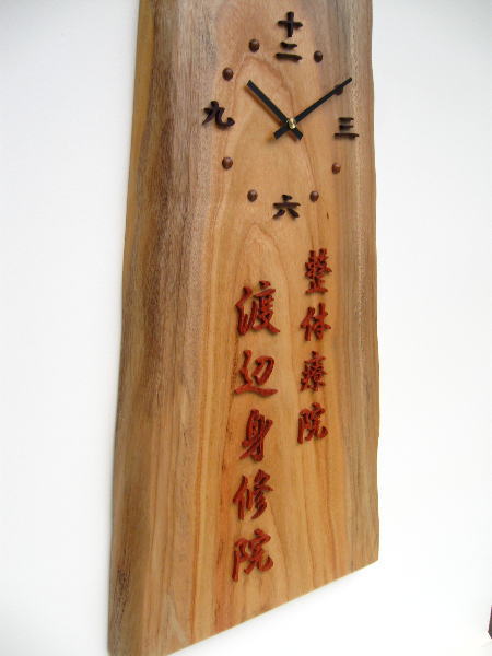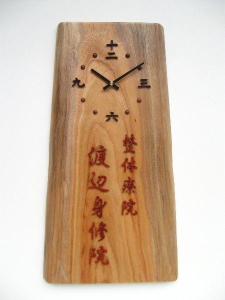 | 「整体療院 渡辺身修院」様への開院祝いの時計です。 「和」のイメージで「耳付き板」風のデザインでお作りしました。 本体に「クスノキ」を使いました。 「クスノキ」は天然の樟脳を採る木で、独特の香りがあります。 虫が寄ってこないとの理由で昔から大切なものを入れる箱物に使われていました。 樹齢が何百〜千年という木もあるもどの長寿で、信仰の対象として昔から神社仏閣に植えられています。 直径1メートルをこえる大木になります。 |