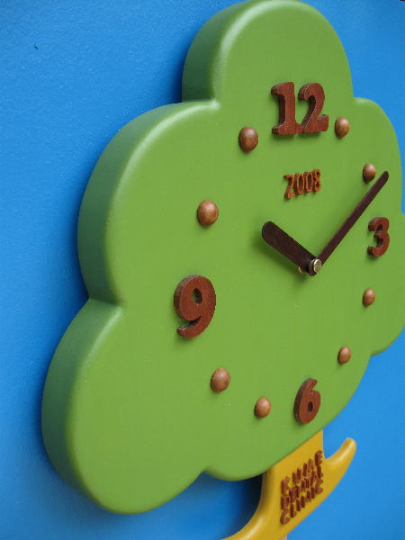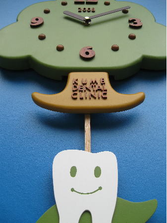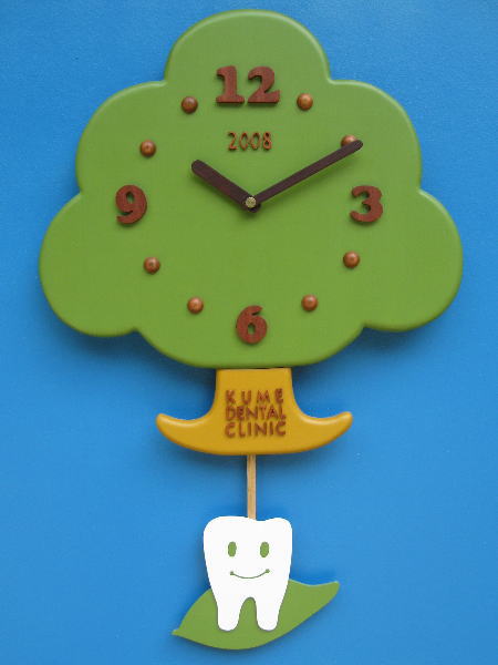 | 「くめ歯科クリニック」様への開院祝いの振り子時計です。 医院の【キャラクター】をそのまま振り子にしています。 医院名のロゴもそのまま利用しています。 時計の雰囲気は「くめ歯科クリニック」様のホームページよりイメージしたものです。 全体のバランス、色の雰囲気がとても良いと思います。 時計の針も全体の雰囲気に合わせて木で作りました。 振り子は風になびくように左右にゆれます。 時計のムーブメント以外はすべて木製の振り子時計です。 |