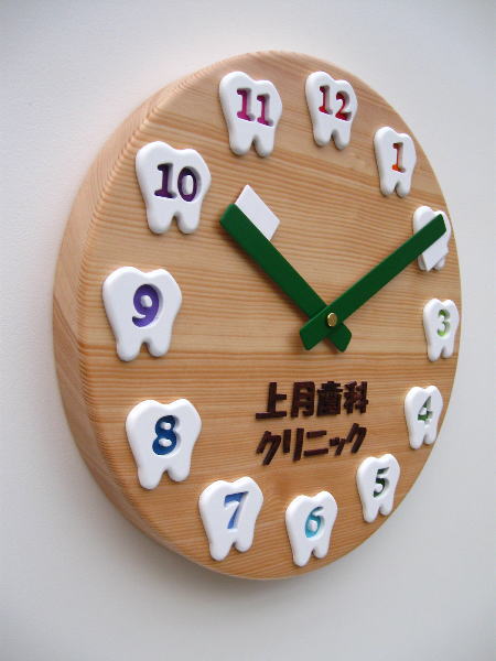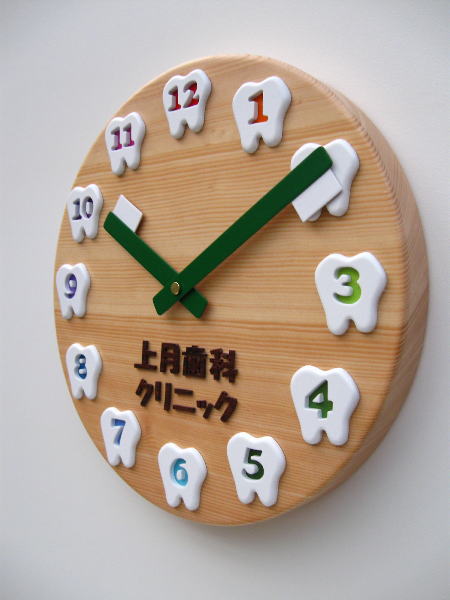 ■文字盤が歯・針が歯ブラシの医院名入り丸型掛け時計■
