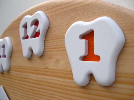 文字盤に「歯」を、針に「歯ブラシ」を使った丸型掛け時計です。