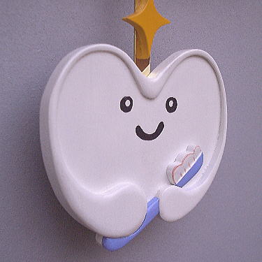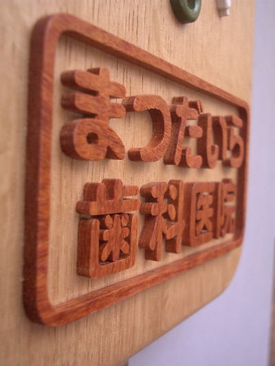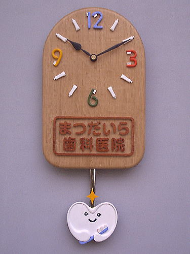 | まつだいら歯科医院様の「キャラクターの歯」を振り子にしました。 文字盤の数字は「歯ブラシ」、その他は「はみがきこ」です。 時計のムーブメントと針以外はすべて木製の振り子時計です。 歯科医院様の開院のお祝い、記念として大変好評です。 |