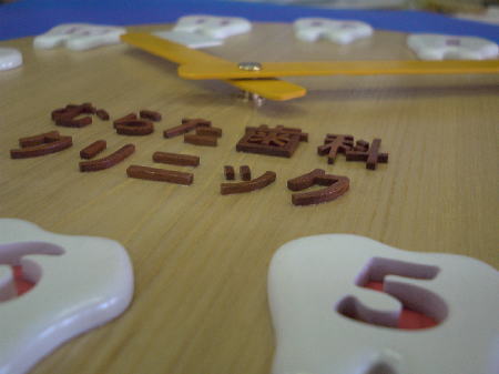 文字盤に【歯】を、針に【歯ブラシ】を使った掛け時計です。