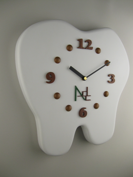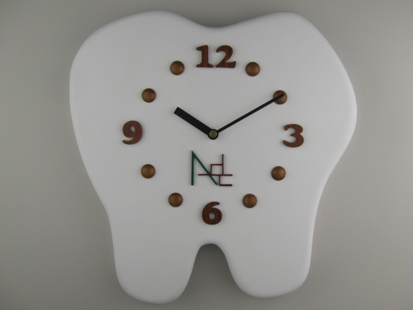 | 歯科医院様への開院祝いの「歯の形をした掛け時計」です。 医院様のロゴマークを再現して時計に入れました。 この時計は落ちついたタイプですが、文字盤などに色を着けるとかわいい感じになると思います。 色を塗った文字盤の例はこちらをご参考にして下さい。 歯の時計は本体【サイズ・厚み・素材】を変更することにより、幅のあるご予算に対応できます。 |