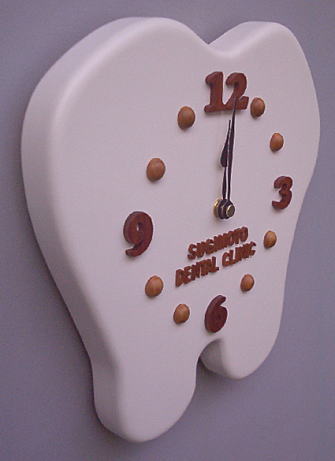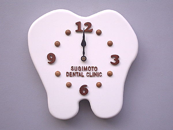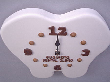 | 歯科医院様への開院祝いの歯の形をした掛け時計です。 この時計は落ちついたタイプですが、文字盤などに色を着けるとかわいい感じになると思います。 色を塗った文字盤の例はこちらをご参考にして下さい。 この作品はサイズ・色を変更することにより、幅のあるご予算に対応できます。 |