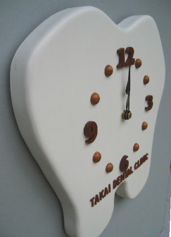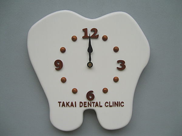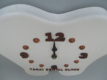 | 歯科医院様への開院祝いの歯の形をした掛け時計です。 この時計は落ちついたタイプですが、文字盤などに色を着けるとかわいい感じになると思います。 色を塗った文字盤の例はこちらをご参考にして下さい。 この作品はサイズ・色を変更することにより、幅のあるご予算に対応できます。 |