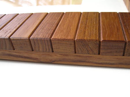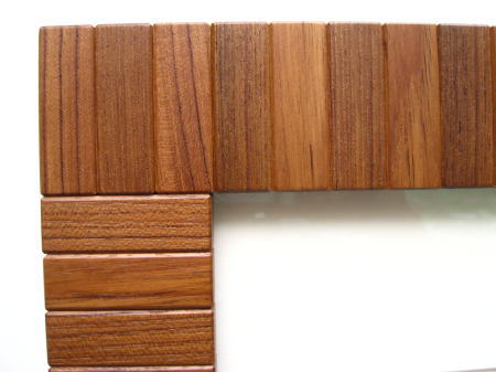 色目の違う木目を順に貼り合わせています。 素材はチークです。
