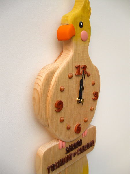 | 「さくら」ちゃんと言う名の「オカメインコ」をモチーフにしました。 動物は大抵、時計にデザインすることが出来ると思います。 特に丸っこいアニマルはかわいい作品になります。 ご希望の動物をお知らせ頂けますと幾つかのデザイン画をお送りいたします。 |