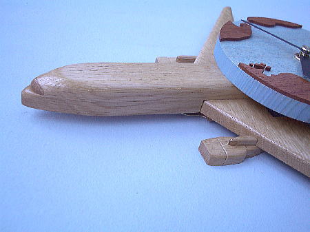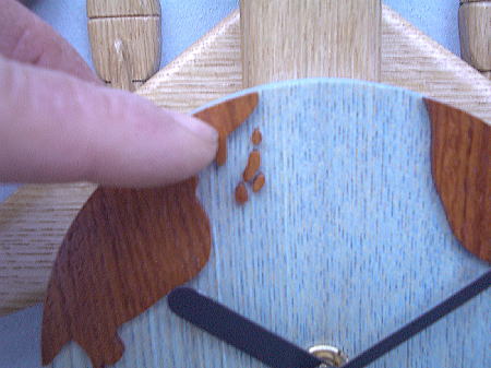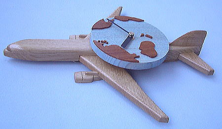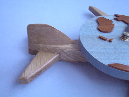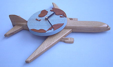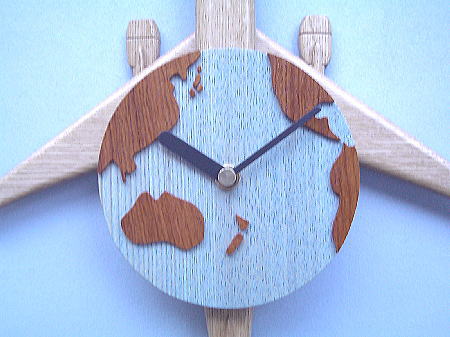 航空機(ボーイング777)の時計です。 ←この時計をもとに、お客様がデザインを考えられました。 私には思いつかない発想でした。 地球が素敵です。 難しい仕事でしたが、面白く楽しい仕事でした。 壁掛け専用です。 時計のムーブメントと針以外はすべて木製の振り子時計です。 |