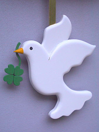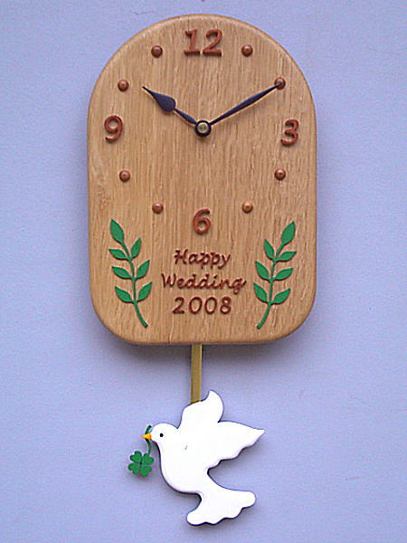 | 平和の象徴の「鳩」が幸せの「四葉のクローバー」を二人のもとに運んでいます。 ナチュラルな雰囲気のやさしい贈り物です。 時計のムーブメントと以外はすべて木製の掛け時計です。 |