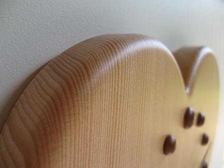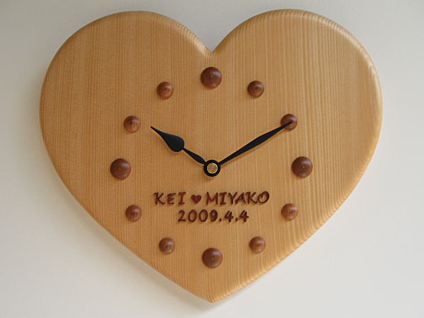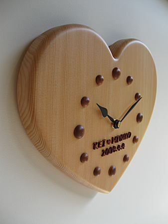| ハートの形をした掛け時計です。 シンプルですが、飽きがこず、時間とともに良い感じになる作品です。 お好きなコメントを木の切り文字でお入れいたします。 |