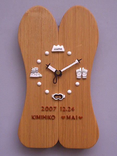 | 【スキー】がテーマの時計です。 時計の本体が 【スキー板】、板は「カービングスキー」と言われる 従来の寸胴のものではなく中央がくびれた板でとのご指定です。 文字盤に 【雪山】 【グローブ】 【ゴーグル】 【ブーツ】 時計の針に 【ストック】 の掛け時計です。 雪山の「HAPPO」は【長野県白馬 八方尾根スキー場】のことです。 時計のムーブメントと以外はすべて木製の掛け時計です。 |