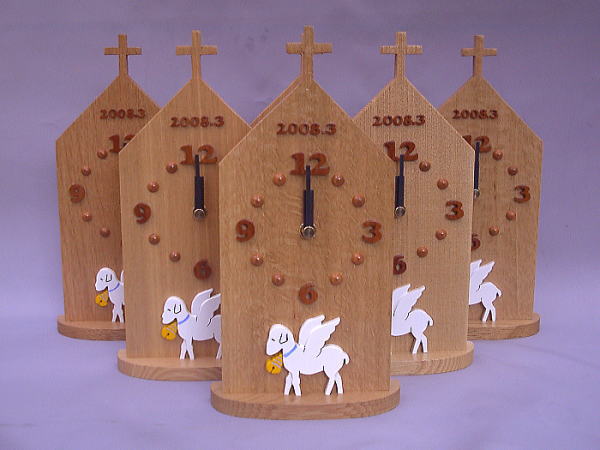 | 「こひつじ幼稚園」様の卒園記念の置き時計です。 時計のムーブメントと針以外はすべて木製の掛け時計です。 園のキャラクターの「ひつじ」をモチーフにしました。 前回の掛け時計とデザインを替えての製作です。 おなじキャラクターを使う場合は年度によっていろいろとバージョンを替えて行きます。 「キャラクター」や「かわいいロゴ」がある幼稚園、保育園様にはお勧めです。