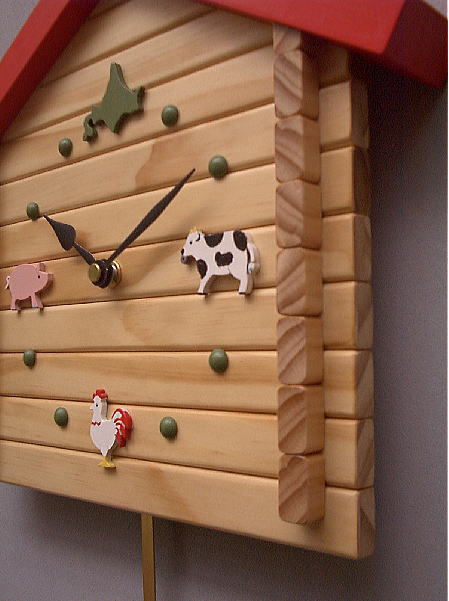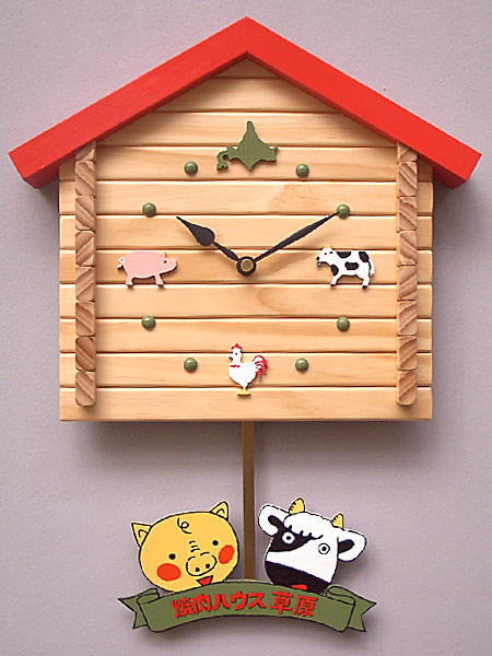 | 北海道で営業中の「焼肉ハウス草原」様の開店20周年記念の振り子時計です。 振り子のお店のキャラクターでもある「ブタとウシ」の看板を使いました。 この絵はこの店のご主人のお子様達が考えられたそうです。 そのお子様達からの贈り物です。 とても素敵なことだと思います。 お店がログハウスなので時計の本体をログ風にしました。 文字盤には【北海道】とお肉の【牛】 【鳥】 【ブタ】を使いました。 どちらもお子様達のアイデアです。 北海道となるとなかなかお店には行けそうにありませんが、(工房は広島県です) 何年かたって北海道旅行の途中でお店に行き、時計と再会なんていいかもしれません。 「開店30周年」あたりになりそうですが・・・