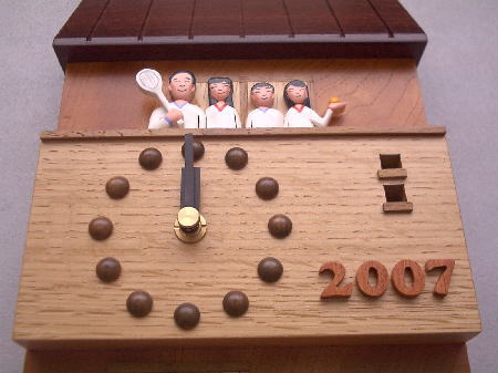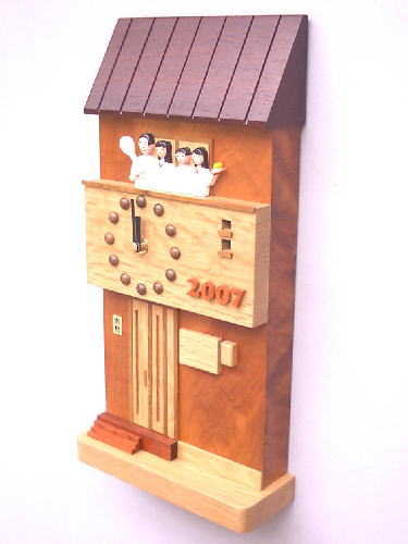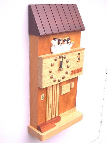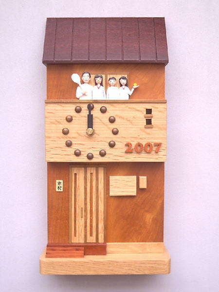 ご家族の人形入りの家型時計です。時計の機械以外は全て木製の時計です