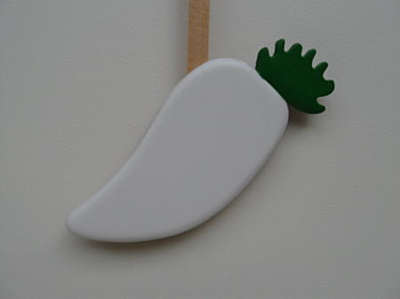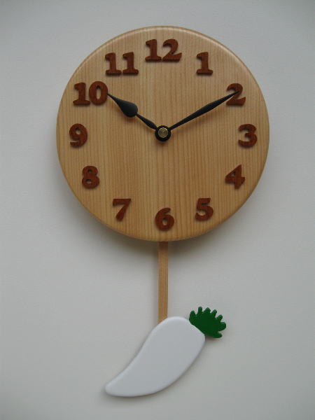 | 幼稚園の「クラス名」の【ダイコン組】の【ダイコン】を振り子に使った卒園記念の振り子時計です。 園児様に贈るものではなく、保護者様から幼稚園様へお贈りする記念品です。 同園にはこの他に「13種類」の振り子時計をお作りしました。