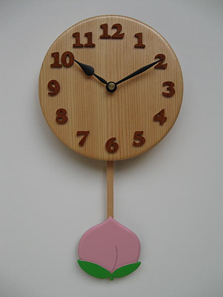 | 幼稚園の「クラス名」の【もも組】の【もも】を振り子に使った卒園記念の振り子時計です。 これは園児様に贈るものではなく、保護者様から幼稚園様へお贈りする記念品です。 同園にはこの他に「13種類」の振り子時計をお作りしました。