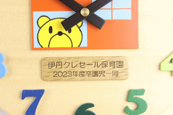 | 卒園記念品としてお作りした「直径25cm」の円形の掛け時計です。 イラストが針に隠れても大丈夫なデザインに限定されますが、ロゴ・ロゴマークを大きく入れることが出来ます。 板厚は「15ミリ」です。 ご予算に合わせて「デザイン・サイズ・厚み」を調整します。 ※「時計機械・吊り金具」以外はすべて木製です。 |